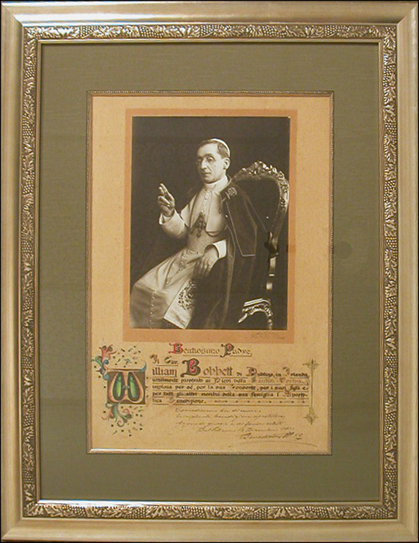 Pope from 1914 - 22. Handsome 18 x 25 papal blessing, in Latin, with a nice 10.5 x 14 of the pope with his hand raised in blessing, for William Bobbett, of Dublin, Ireland, with Benedict adding four lines in untranslated Italian, then signing. Mounted to 19.5 x 25 heavy cardstock, then cloth matted and framed to an overall size of 29 x 37, with some light soiling, wear to the left and right edges, and with the lower left corner torn off and refastened with tape to the reverse, otherwise fine condition. RRAuction COA. Oversized.