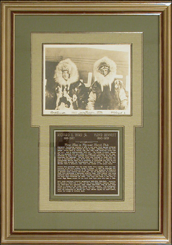 Incredible vintage 8 x 10 Pathe News photo of Byrd and Bennett in full cold weather gear, poising outside what appears to be an airplane, signed in fountain pen, 'R. E. Byrd,' and 'Floyd Bennett.' Each has signed under his associate's image. Double cloth matted and framed with an extensive biographical plaque, to an overall size of 19.5 x 27.5. In fine condition. RRAuction COA. Bennett's signature is rare and this is the first photo of Byrd and Bennett together we have seen. Oversized.