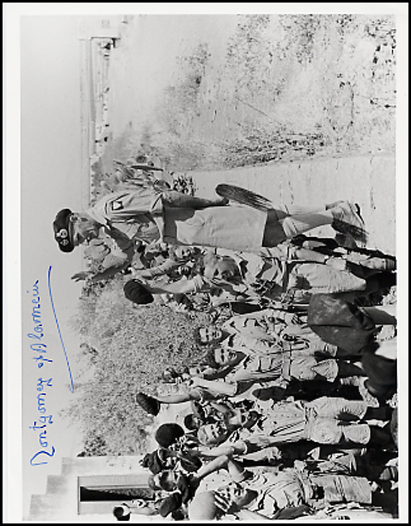 Glossy 7 x 5 photo of Montgomery standing atop a wall informing the members of the Canadian 14th Tank regiment of Mussolini's resignation, signed in blue ink. In fine condition. RRAuction COA.