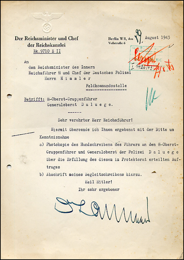 Reich Minister and Chief of the Reich Chancery in the Nazi regime. TLS in German, one page, 8.5 x 11, Reichminister letterhead. Letter to Himmler. In fine condition, with several official stamps and notations and punch holes to left edge. RRAuction COA.