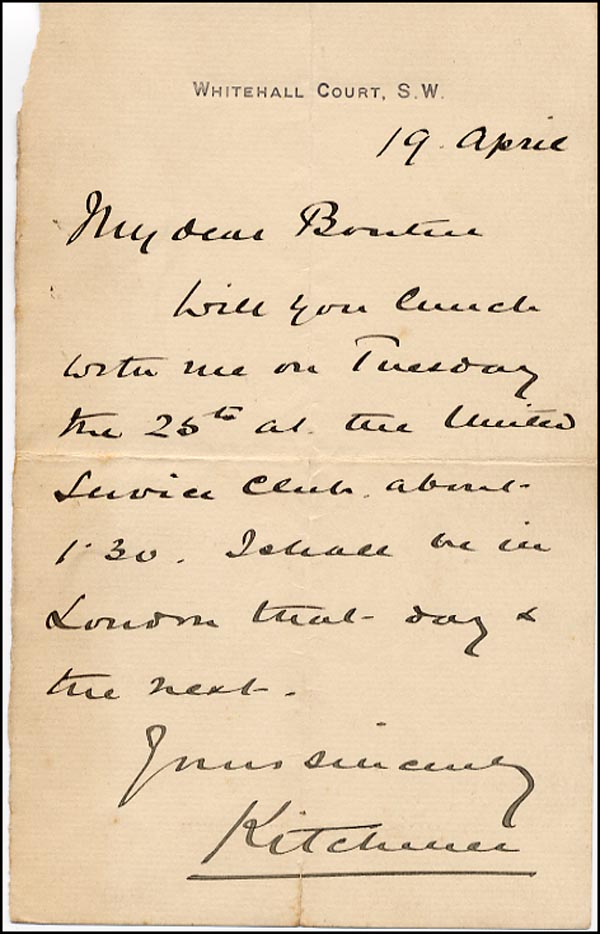 ALS signed 'Kitchener,' one page, 4.5 x 7, Whitehall Court letterhead, April 19. Kitchener sends an invitation. In part, 'Will you lunch with me...at the United Service Club about 1:30.' In fine condition, with minor fold separations ans missing tip of top left corner. RRAuction COA.