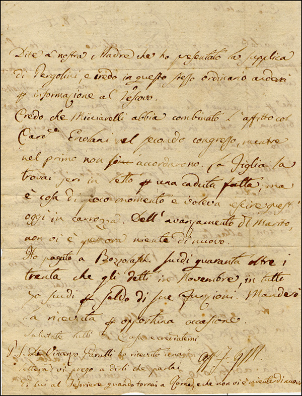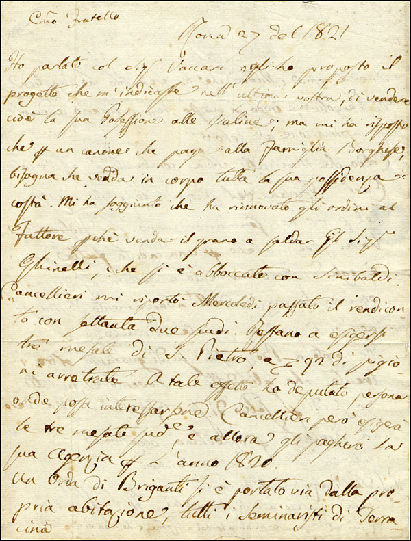 ALS in Italian, signed 'your affectionate brother, G. M.,' one page both sides, 7.5 x 10, December 27, 1821. Letter to his brother, written just two years after his ordination as a priest and just shortly after his assignment to the papal diplomatic corps in Rome. Letter deals with financial matters, promotions he was attempting to influence and also mentions his mother. In fine condition, with mild show through from text on reverse, expected folds and integral second page addressed in another hand. RRAuction COA.