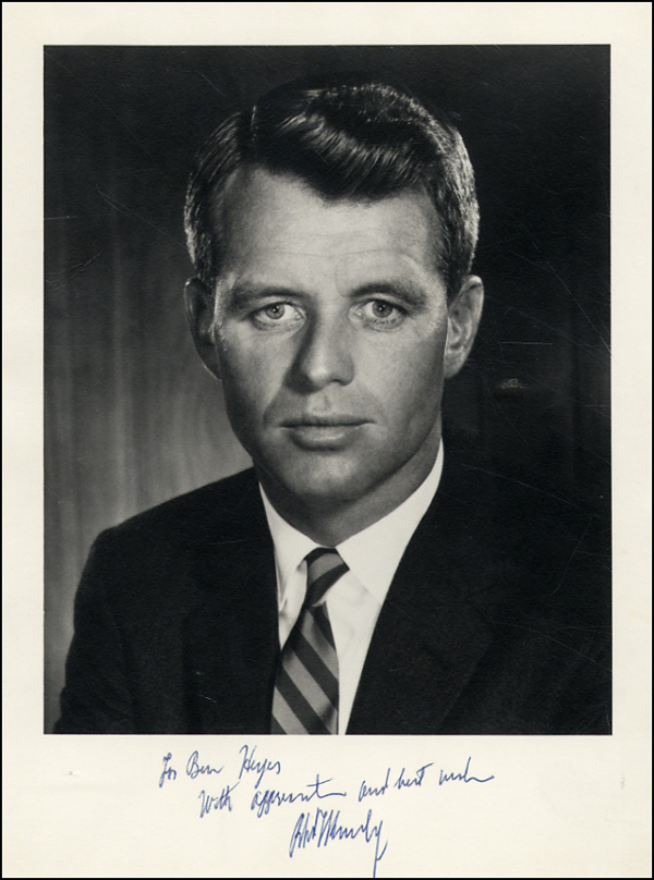 Vintage matte-finish 8 x 10 portrait photo, signed and inscribed in blue ballpoint 'For Ben Hayes, With appreciation and best wishes, Robert Kennedy.' Archivally double matted and framed to an overall size of 13.25 x 15.5. In fine condition. COA John Reznikoff/University Archives and RRAuction COA included.
