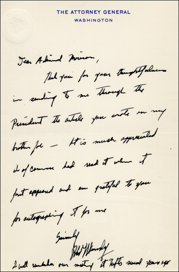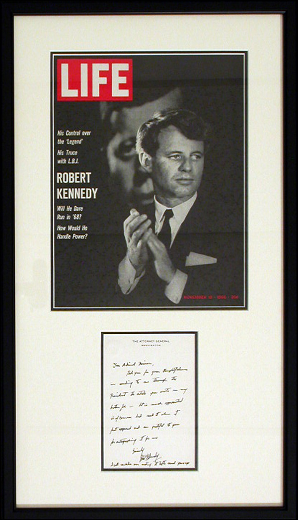 ALS, one page, 5 x 7, Attorney General letterhead, no date. Letter of thanks to an Admiral Morison. In full, 'Thank you for your thoughtfulness in sending to me through the President the article you wrote on my brother Joe - It is much appreciated. I of course had read it when it first appeared and am grateful to you for autographing it for me.' Kennedy also adds a brief postscript, 'I well remember our meeting at Tufts several years ago.' Archivally double matted and framed with a cover of the November 18, 1996 Life magazine cover of Kennedy, to an overall size of 16 x 28. In fine condition. COA John Reznikoff/University Archives and RRAuction COA. Oversized.