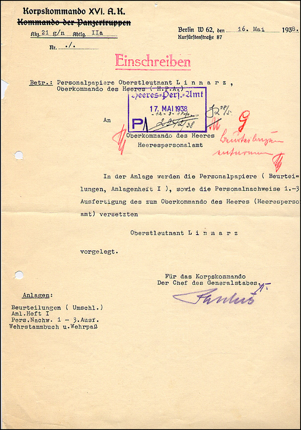Infamous commander of the Nazi 6th Army which surrendered at Stalingrad to the Russians. Letter to the Wehrmacht personnel office forwarding personal papers on to Lt. Col. Linnarz for his review. Signed at the conclusion in blue pencil. In fine condition, with several pencil notations and punch holes to left edge. RRAuction COA.