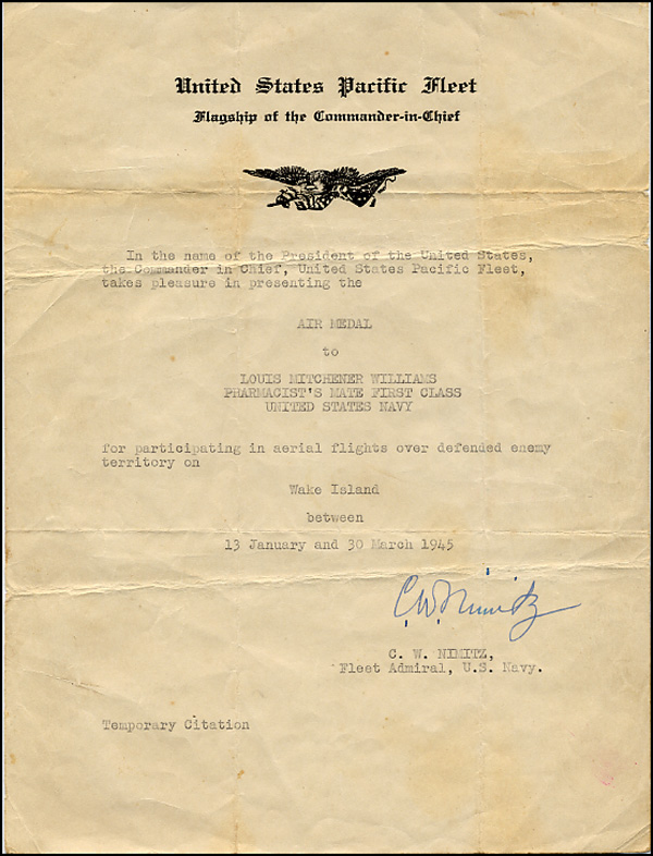 TLS signed 'C. W. Nimitz,' one page, 8 x 10.5, United States Pacific Fleet letterhead, no date. Temporary citation awarding the Air Medal to Louis M. Williams, 'for participating in aerial flights over defended enemy territory on Wake island between 12 January and 30 March, 1945.' In very good condition, with light toning, scattered wrinkling and a mailing fold through portion of last name. RRAuction COA.
