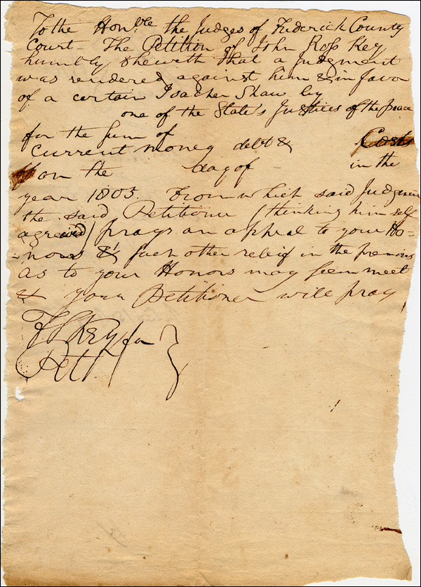 Baltimore lawyer who was inspired to write The Star Spangled Banner after he witnessed the bombardment of Fort McHenry by the British in 1814. DS, signed 'F. S. Key for Pet.,' one page, 5.5 x 8.25, August 15, 1805. Legal document, written entirely in Key's hand, seeking to overturn a judgement against his father. In part, 'The petition of John Ross Key humbly and herewith that a judgement was rendered against him and in favor of a certain Isaac Shaw...in the year 1805...pray an appeal to your Honors and seeks other relief.' Key also dockets the reverse, 'Mr. Ritchie, File this and fill up the blanks by the Jud't, Yours, F. S. Key.' In fine condition, with light toning, uneven right edge and a few spots. COA John Reznikoff/University Archives and RRAuction COA.