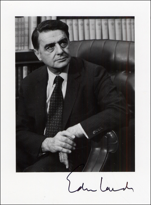 Physicist and inventor of the Polaroid camera. Rare glossy 4 x 5.5 photo of Land sitting in a chair, signed in the lower border in black felt tip. In fine condition. RRAuction COA.