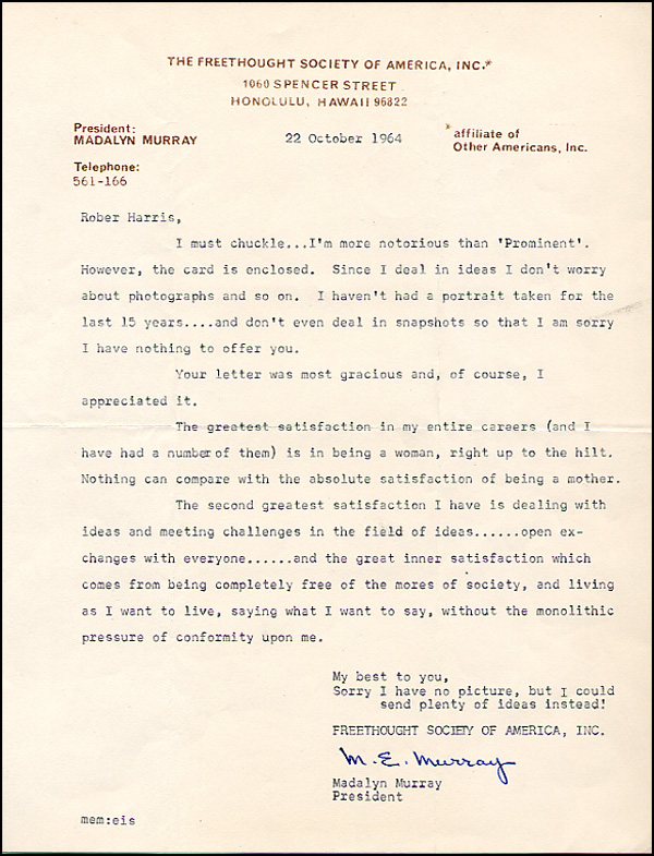 Social activist. She enjoyed a normal, happy childhood, but was overwhelmed when she read the Bible cover-to-cover at age 13. She gradually became an atheist and when her son Bill objected to school prayers, she took the case to the Supreme Court; in a landmark decision outlawing prayers in public schools, she won, in her words, the "unalienable right to freedom from religion as well as freedom of religion" (1963). TLS signed 'M. E. Murray,' one page, 8.5 x 11, The Freethought Society of America, Inc. letterhead, October 22, 1964. Letter to a collector in response to the question of her greatest career satisfaction. In part, 'The greatest satisfaction in my entire careers (and I have had a number of them) is in being a woman, right up to the hilt. Nothing can compare with the absolute satisfaction of being a mother. The second greatest satisfaction I have is dealing with ideas and meeting challenges in the field of ideas...and the great inner satisfaction which comes from completely free of the mores of society, and living as I want to live, saying what I want to say, without the monolithic pressure of conformity upon me.' In fine condition. RRAuction COA.