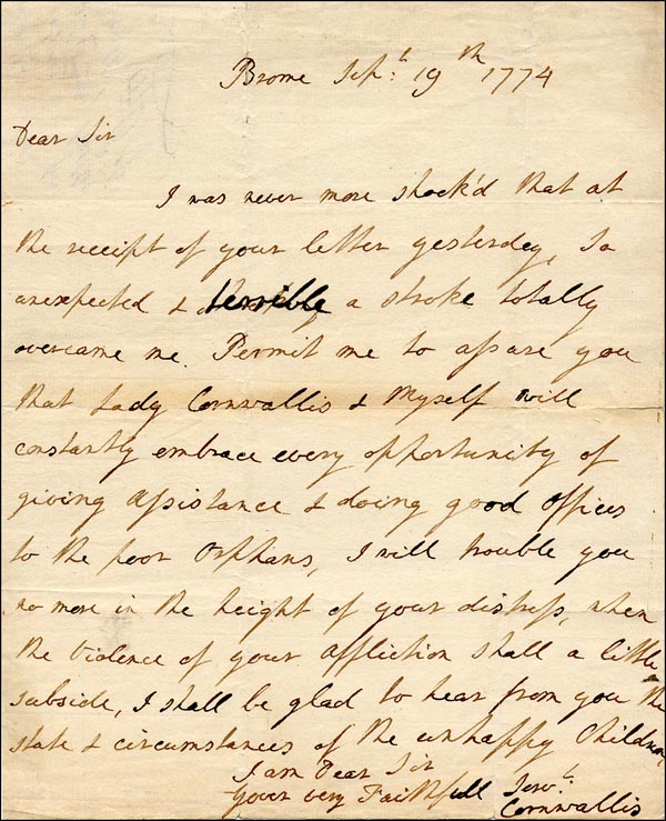 English general who fought against Washington during the American Revolution and was finally defeated at Yorktown. ALS, signed 'Cornwallis,' as lieutenant colonel of the Twelfth Regiment of Foot, one page, 7.25 x 9, February 19, 1774. Cornwallis expresses his concern at the distressing circumstances of a group of orphans. In full. 'I was never more shock'd at the receipt of your letter yesterday, so unexpected and terrible a stroke totally overcame me. Permit me to assure you that Lady Cornwallis and myself will constantly embrace every opportunity of giving assistance and doing good offices for the poor orphans, I will trouble you no more in the height of your distress, when the violence of your affliction shall a little subside, I shall be glad to hear from you the state and circumstances of the unhappy children...Cornwallis.' In fine condition, with an area of light toning and minor tearing along the folds not resulting in any paper loss. An attractive letter bearing what is tantamount to a double signature as he includes 'Cornwallis' in the text. COA John Reznikoff/PSA/DNA and RRAuction COA.