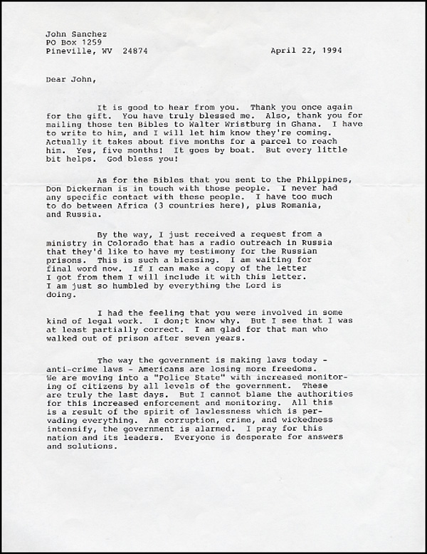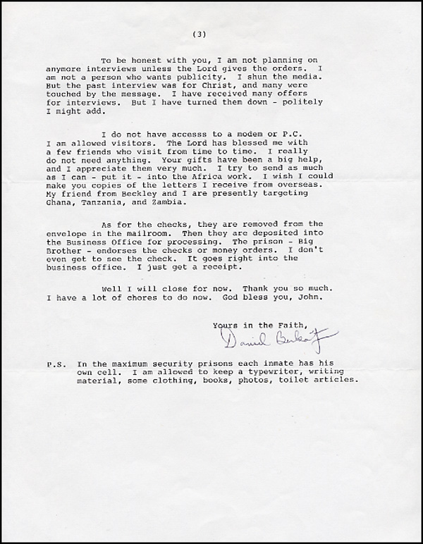 TLS, three pages, 8.5 x 11, April 22, 1994. Berkowitz writes about his life in prison, the Christian outreach ministries he is involved with in Africa, Romania and Russia, comments on the efficacy of anti-crime laws, his completion of two years of college while in prison, etc. Fascinating content. In fine condition, with light surface creases. RRAuction COA.