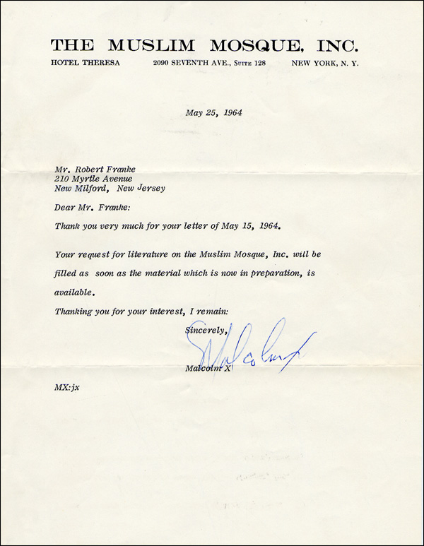 TLS, one page, 8.5 x 12, Muslim Mosque letterhead, May 25, 1964. Malcolm replies to a request for information. In full: 'Thank you very much for your letter of May 15, 1964. Your request for literature on the Muslim Mosque, Inc. will be filled as soon as the material which is now in preparation, is available. Thanking you for your interest, I remain: Sincerely, Malcolm X.' In fine condition. Accompanied by the original mailing envelope. COA John Reznikoff/University Archives and RRAuction COA.