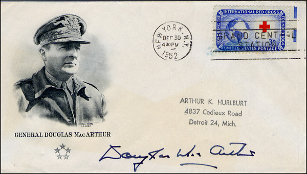 Commemorative cover, 6.5 x 3.75, with a handsome cachet of MacArthur himself, signed along the bottom in fountain pen, 'Douglas MacArthur.' In fine condition. RRAuction COA.