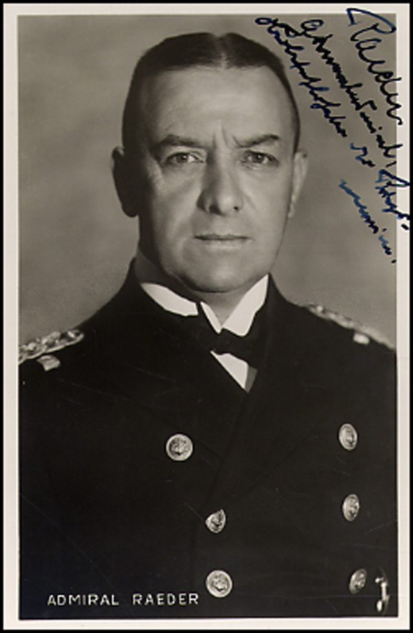 Commander in Chief of the Navy, 1937, although not a devoted Nazi. Made Grand Admiral in 1939, and served until military differences forced Hitler to retire him in 1943. Convicted at Nuremberg and sentenced to life imprisonment, released in 1955 due to poor health and died in 1960. Vintage 3.5 x 5.5 Hoffmann postcard photo, signed in fountain pen, 'Raeder,' adding his rank underneath. In fine condition, with a bit of scattered light silvering and surface marks. RRAuction COA.