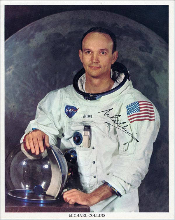 Color 8 x 10 NASA photo of Collins in his spacesuit posing against a lunar backdrop, signed in black felt tip. In fine condition. RRAuction COA.