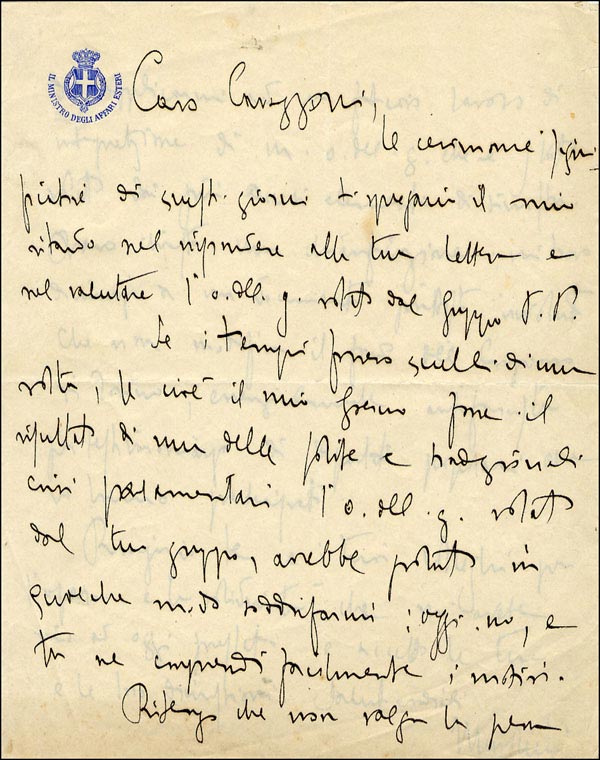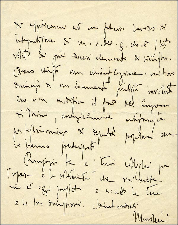 Bombastic Italian dictator, known as 'Il Duce.' Mussolini styled himself in the mold of Roman emperors and had ambitions to match. In the end, he met with the same bloody fate as some of his ancient predecessors, captured and killed by Italian partisans and hung upside down from the girder of a filling station. ALS in Italian, signed 'Mussolini,' two pages on two adjoining sheets, 8 x 10, Ministry of Foreign Affairs letterhead, no date. Letter to an unknown recipient. Mussolini writes that the ceremony has prevented him from answering sooner. In part, 'If the times favor a new direction one must await for certain parliamentary results. Today you will not easily understand the motives. One must understand the sharpest elements of the left.' In fine condition, with a light shade of toning to pages. COA John Reznikoff/University Archives and RRAuction COA.