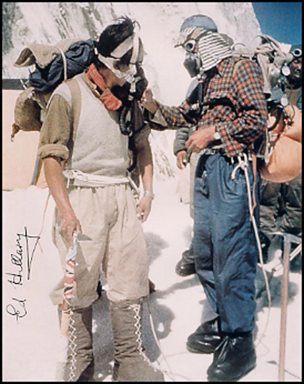 Color satin-finish 8 x 10 photo of Sir Edmund and Tenzing Norgay, signed in black ink. In fine condition. RRAuction COA.
