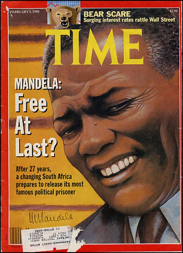 Time magazine cover from the February 5, 1990 issue, featuring Mandela on the cover, signed in ballpoint, N. Mandela.' In fine condition, with a mailing label to lower left corner and some scattered light edge wear. RRAuction COA.