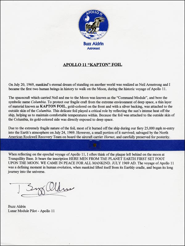 DS, one page, 8.5 x 11, Apollo 11, Buzz Aldrin, Astronaut letterhead, no date. A flown piece of the Columbia's Command Module gold 'Kapton' foil. Mounted to the 11 x 8.5 sheet telling the story of the flight and a complete description of the material's role on the spacecraft, nicely signed in black ink by Aldrin. In fine condition. RRAuction COA.