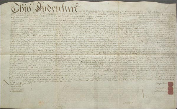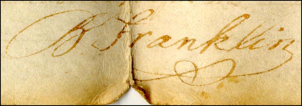 DS, signed 'B. Franklin,' one page, 24.5 x 15, December 28, 1722. Indenture agreement between George and Esther House and John Adam Stafford concerning payment for a parcel of land. In very good condition, with a document fold through first letter of last name, small fold separation impinging on the paraph, signature a couple of shades light, light overall toning, intact seals and expected folds. COA John Reznikoff/University Archives and RRAuction COA.