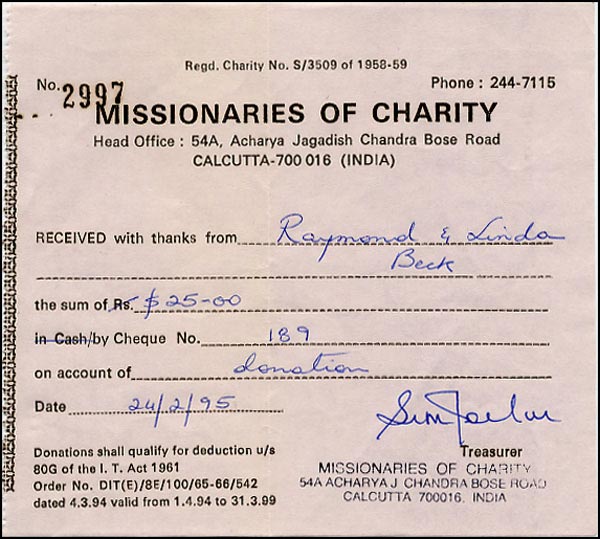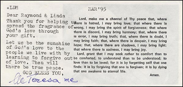 TLS signed 'M Teresa mc,' one page, 6.25 x 3, March 1995. Short letter of thanks for a donation, typed down the left edge of a prayer slip. In part, 'Thank you for helping spread the fragrance of God's love through your gift.' Accompanied by the original mailing envelope and a Missionaries of charity receipt for the donation. In fine condition. RRAuction COA.