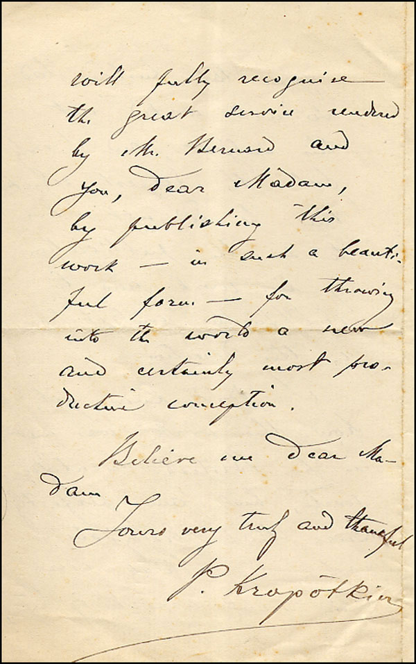 Russian political theorist whose notion of anarchist communism proposed that private property and unequal distribution of wealth should give way to the free distribution of goods and services. ALS signed 'P. Kropotkin,' four pages on two adjoining sheets, 4.5 x 7.25, July 31, 1911. Letter to a lady expressing his thoughts on a book on Evolution. In part, 'I was brought all the time to the conclusion that there must exist a protoplasmic inter-communication between the cells of animals, as well as plants. I regret that nobody, to my knowledge, has gone into a thorough study of the subject.' In fine condition, with some mild toning. RRAuction COA.