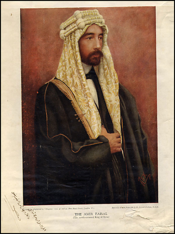 King of Syria (1920) and Iraq (1921-1933). Color 9 x 12 book plate with the printed 'The Amir Faisal (the newly crowned King of Syria),' signed in Arabic at lower left corner beneath the image, matted to an overall size of 11 x 14. In very good condition with a 3-inch diagonal tear at lower right margin, scattered light age toning and faint soiling. RRAuction COA.