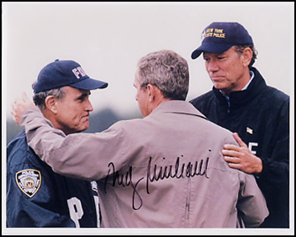 Emotional color glossy 10 x 8 photo of of Giuliani, George W. Bush and Governor Patacki, signed in black felt tip by Giuliani. In fine condition. RRAuction COA.