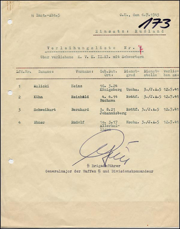 General in the Waffen-SS, Knights Cross with Diamonds winner and Commander 4th SS-Panzer Grenadier Division 'Wiking. DS, in German, signed 'Gille,' one page, 8.5 x 13, June 7, 1943. Promotion list for sour soldiers to receive the Knights Cross with Swords commendation, nicely signed in pencil at the conclusion. In fine condition, with light overall toning, three punch holes to left edge, paperclip marks to top and a horizontal fold to bottom portion. RRAuction COA.