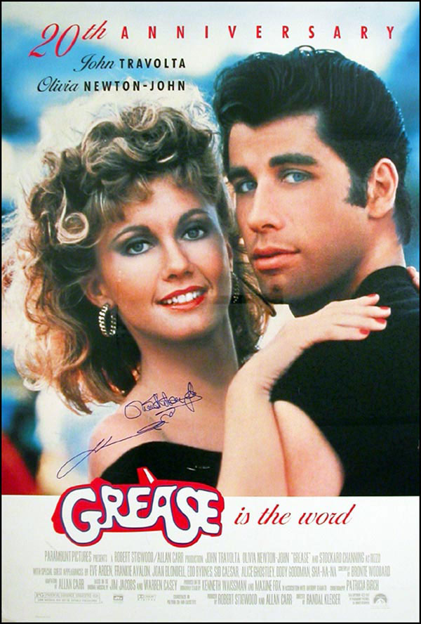 Color 27 x 40 one sheet movie poster for the 20th Anniversary of Grease, signed in blue felt tip by John Travolta and Olivia Newton John. In fine condition, with a bit of light edge wear. Rolled. RRAuction COA.