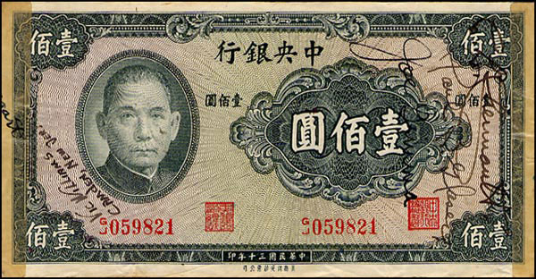 Air Force WWII general, commander of famous Flying Tigers squadron. One hundred yuan Chinese currency, 6.25 x 3.25, signed on the portrait side in fountain pen by Chennault as well as two other individuals. Reverse bears several other signatures and inscriptions. In very good condition, with tape remnants to both edges, a bisecting vertical crease, light wrinkling and some light signature contrast. RRAuction COA.