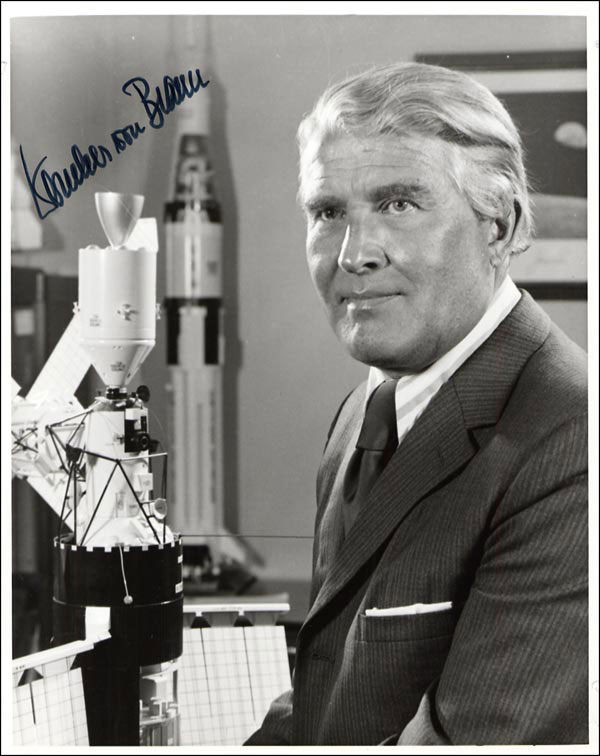 German rocket engineer who designed the first self-contained rocket missile. Glossy 8 x 10 photo of von Braun surrounded by rocket models, signed in black felt tip. In fine condition, with a few light surface impressions. RRAuction COA.