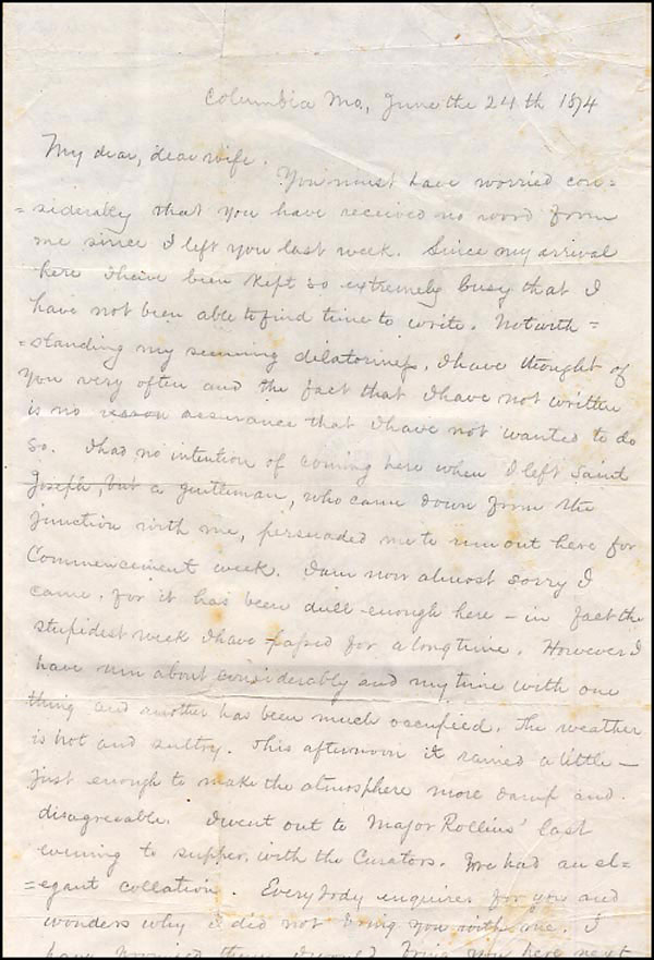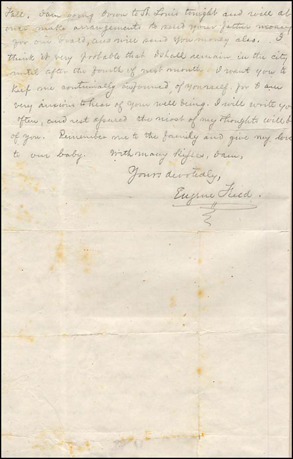 Poet best known for his poems of childhood 'Wynken, Blynken, and Nod' and 'Little Boy Blue.' ALS, one page both sides, 7.5 x 11, June 24, 1874. Letter to his wife Julia. In part, 'You must have worried considerately that you have received no word from me since I left you last week. Since my arrival I have been kept so extremely busy that I have not been able to find time to write...I have thought of you very often...I am now almost sorry I came, for it has been dull enough here - in fact the stupidest week I have faced for a long time...This afternoon it rained a little - just enough to make the atmosphere more damp and disagreeable.' Letter is affixed by its left edge to a slightly larger sheet. In very good condition, with some light toning and spotting, some separations along mailing folds and light creasing. Accompanied by the original mailing envelope. RRAuction COA.
