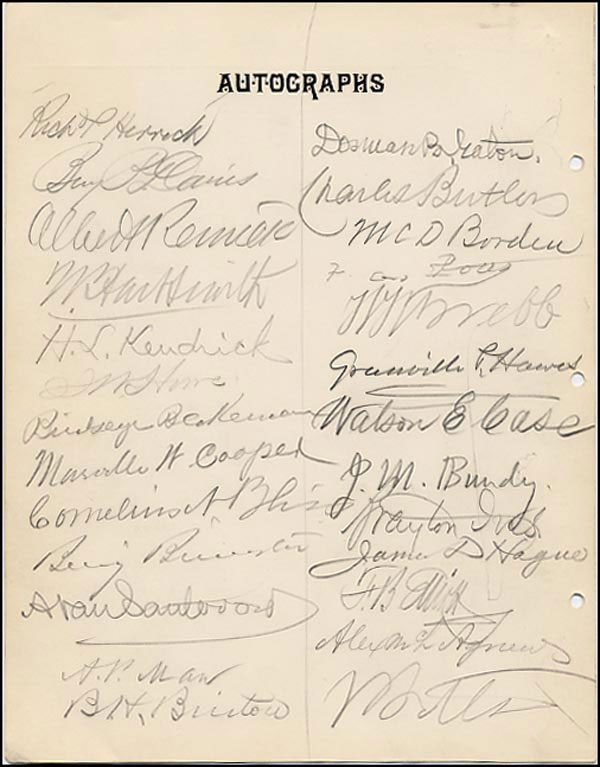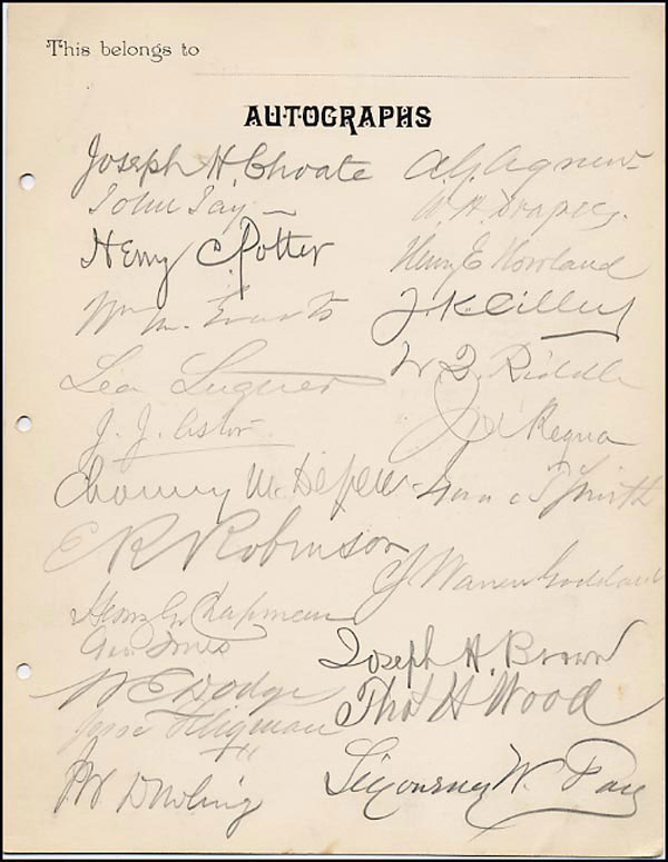 Extraordinary lot of fifty pencil signatures on both sides of a 7.25 x 9.25 autograph card includes: Joseph H. Choate, John Jay, J.J. Astor, W.E. Dodge, Joseph Brown, H.L. Kendrick, James D. Hague, Charles Butler, Henry C. Potter, E.R. Robinson, William Evarts and other notables of the period. In fine condition. RRAuction COA.
