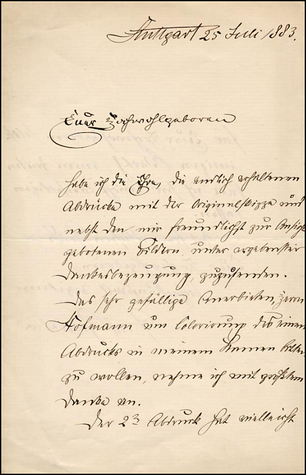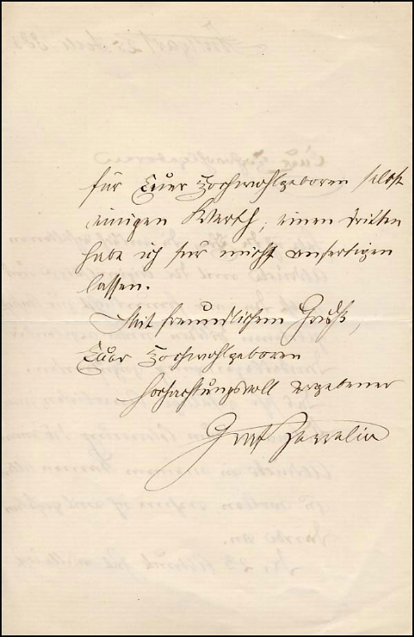 German aeronautical engineer who built nearly 100 powered balloons; the zeppelin is named for him. ALS in German, signed 'Graf v. Zeppelin,' one page both sides, 6.75 x 9, February 25, 1883. Untranslated letter to an official. In fine condition, with a light shade of toning. RRAuction COA.
