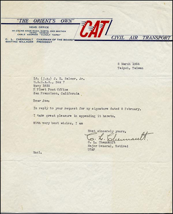 TLS signed 'C. L. Chennault,' one page, 8 x 9.5, Civil Air Transport letterhead, March 8, 1954. Chennault complies with an autograph request. In full, 'In reply to your request for my signature dated 8 February, I take great pleasure in appending it hereto.' In fine condition. RRAuction COA.