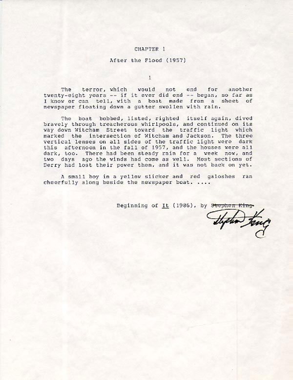 Souvenir typescript, one page, 8.5 x 11. The beginning of his epic novel entitled It, beginning 'The terror, which would not end for another twenty-eight years - if it ever did end - began, so far as I know or can tell, with a boat made from a sheet of newspaper floating down a gutter swollen with rain.' Signed in black ink at the conclusion by King. In fine condition. RRAuction COA.