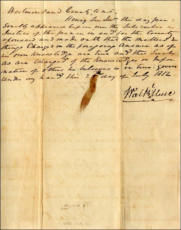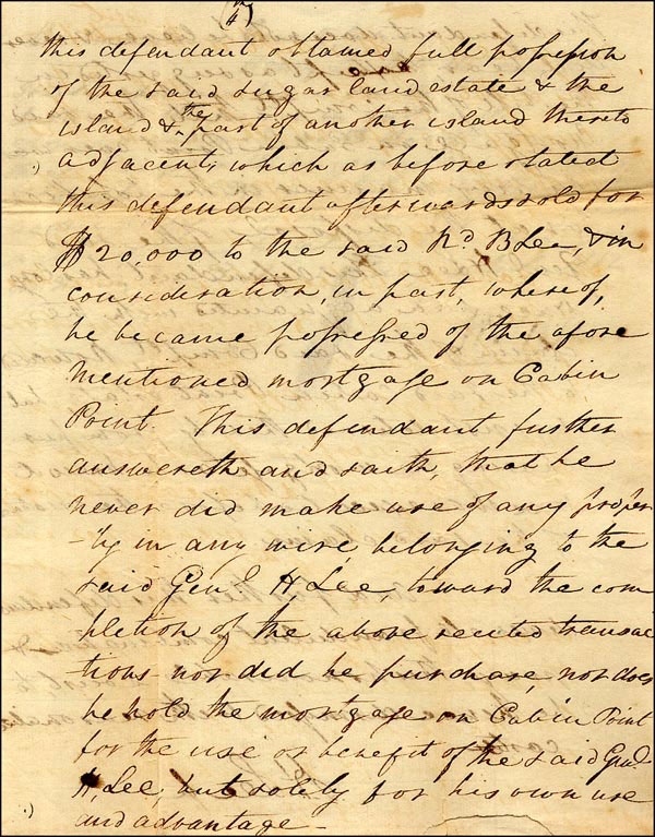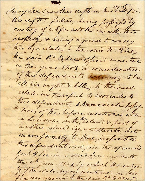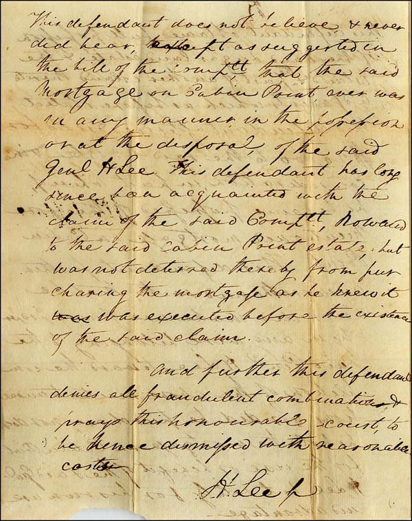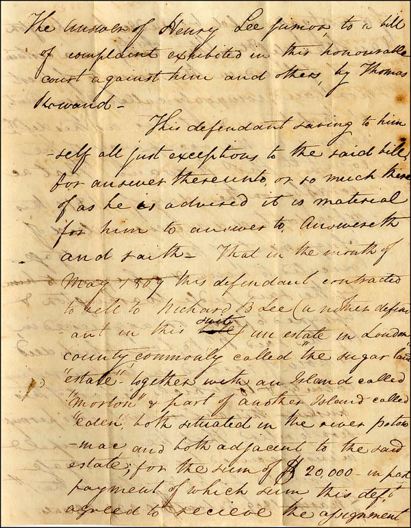 'Light-Horse Harry,' father of Robert E. Lee, was a Revolutionary War hero whose skill as the leader of 'Lee's Legion' captured British posts in New York and in the South. He served in the Continental Congress, and ratified the Constitution as a Virginia delegate. While Governor, he put down the Pennsylvania's Whiskey Rebellion. ADS, signed 'H. Lee, Jr.,' three pages both sides, 7.25 x 9.25, July 23, 1812. Impressive legal document, written by Lee, bearing some form of his signature in the text an additional five times, two as 'Henry Lee,' and three as 'Genl. H. Lee.' Document involves a land dispute between Lee and Thomas Howard. 'The defendant having to himself all first exceptions to the said bill, for answer there unto or so much there as he is advised it is material for him to answer...that in the month of May 1809 this defendant contracted to sell to Richard B. Lee...an estate in Loudon County, commonly called 'the sugar land estate' together with an island called 'Morton' and part of another island called 'Colen,' both situated in the river Potomac, and both adjacent to the said estate; for the sum of 20,000.' Document continues to discuss other land purchases and financial transactions. In fine condition, with light overall toning, expected folds, some light show through from text on reverse, some light spotting and bold writing. COA John Reznikoff/PSA/DNA and RRAuction COA.