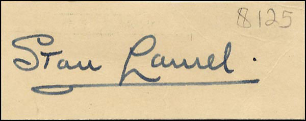 Fountain pen signature, 'Stan Laurel,' on an off-white 2.25 x 1 clipped card and an ink signature and inscription 'Best wishes Gilbert, Oliver Hardy,' on a 3.75 x 2.25 card. In fine condition, with a light crease through a single letter of Laurel's signature, mounting remnants to reverse of both and a bit of light soiling to both. RRAuction COA.