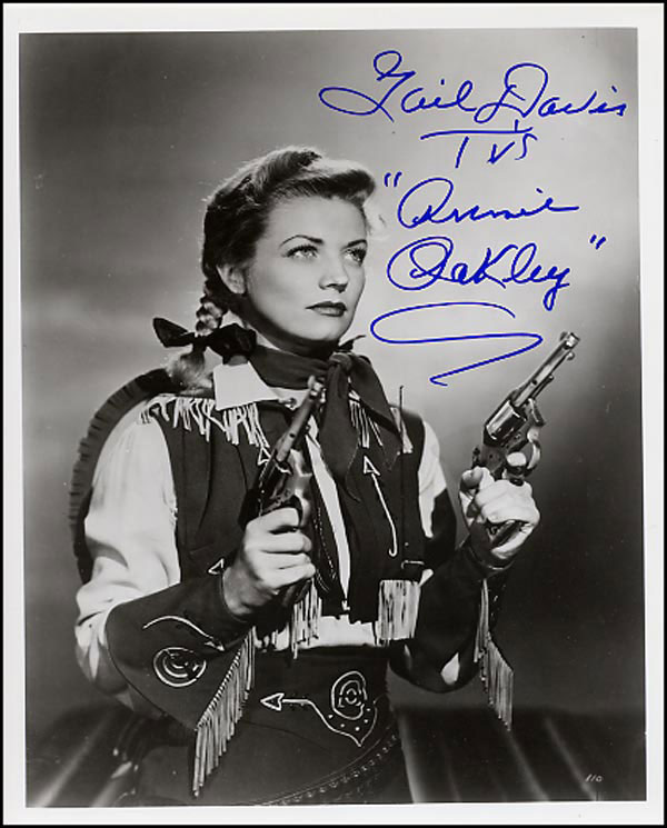 Glossy 8 x 10 photo of Davis as Annie Oakley, signed in blue felt tip, 'Gail Davis, TV's Annie Oakley.' In fine condition. RRAuction COA.