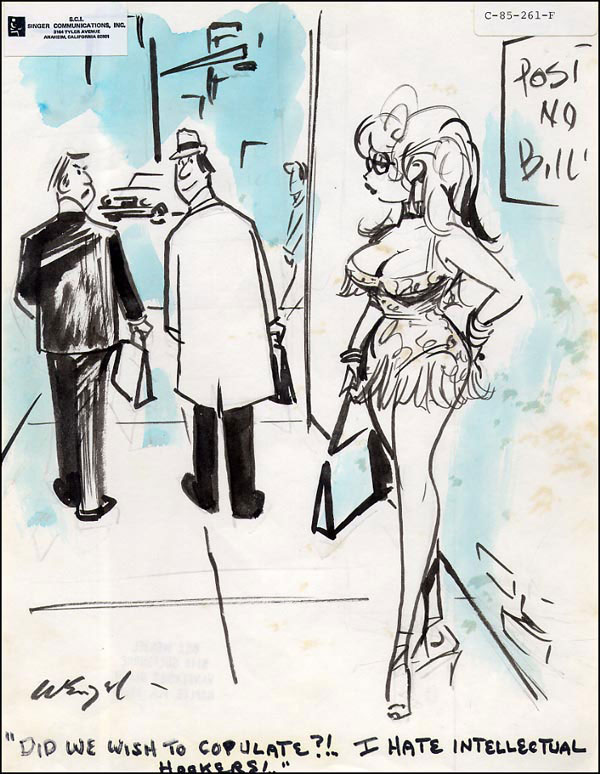 Artist known for his Playboy drawings. Original ink and watercolor Playboy one panel cartoon sketch on an off-white 8.5 x 11 sheet. Cartoon depicts two gentleman after being approached by an educated prostitute. Signed in the lower left corner in ink 'Wenzel.' In fine condition, with a file production label to top right corner . RRAuction COA.