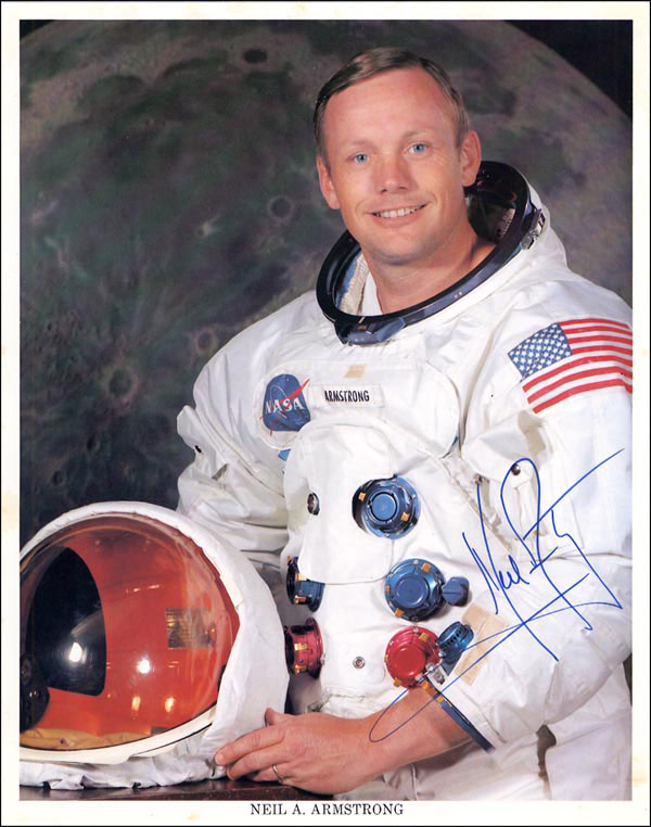 Excellent color 8 x 10 NASA photo of Armstrong in his spacesuit posing against a lunar backdrop, neatly signed in blue felt tip. In very fine condition. RRAuction COA.