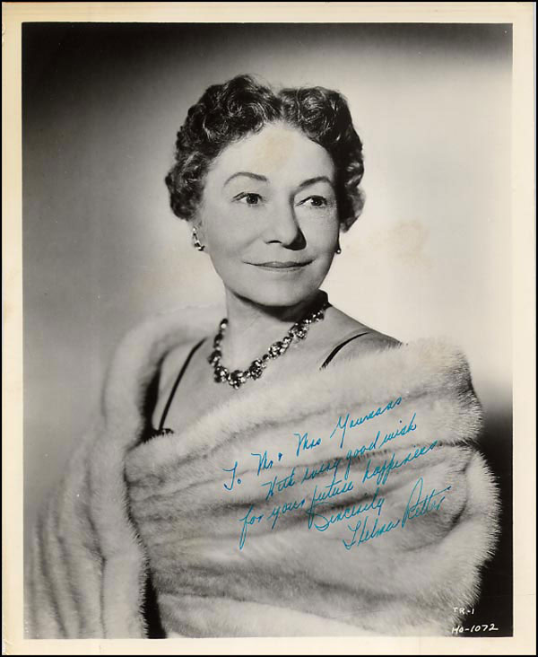 Vintage glossy 8 x 10 photo of Ritter wrapped in a fur, signed and inscribed in fountain pen 'To Mr. and Mrs. Yarness, With every good wish for your future happiness. Sincerely, Thelma Ritter.' In fine condition, with some scattered light surface impressions and photo affixed to an identical size piece of cardboard. RRAuction COA.