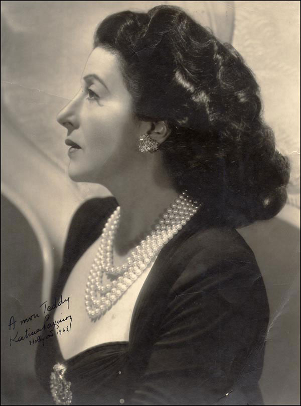 Academy Award winner for her role in For Whom the Bell Tolls. Vintage matte-finish 9.5 x 13 photo, signed and inscribed in fountain pen 'A mon Teddy, Katina Paxinou, Hollywood 1942.' In very good condition, with several light but noticeable creases and trimmed edges. RRAuction COA.