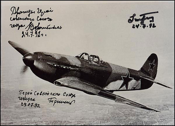 Glossy 11 x 8 photo of an airborne Russian fighter, signed in black felt tip by three top Russian aces: Vitali Popkov, Arsenii Vorozheikin and Konstantin Treshchev. In fine condition. RRAuction COA.