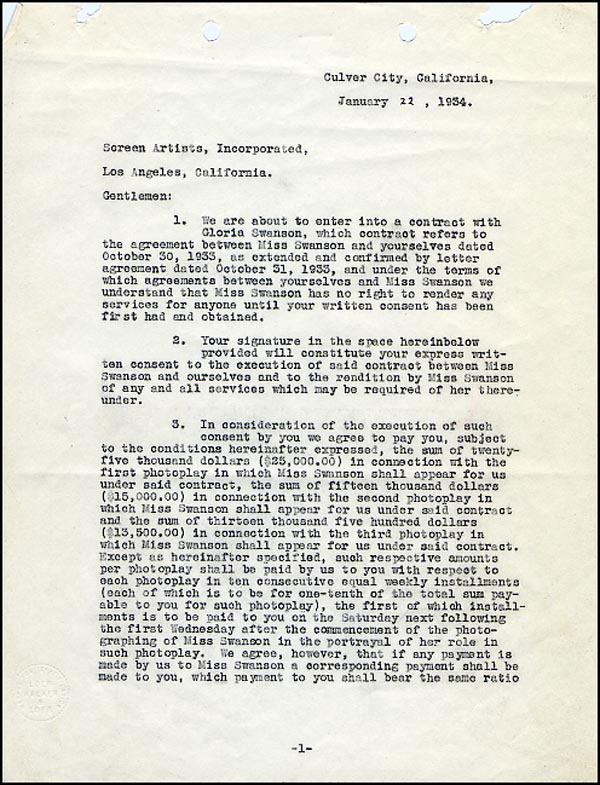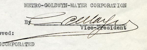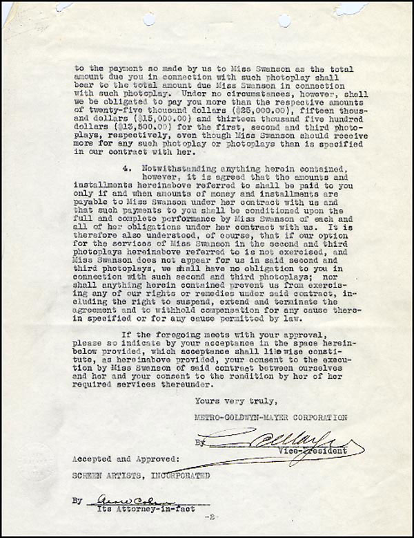 DS, two pages, 8.5 x 11, January 22, 1934. Agreement between MGM and Screen Artists Incorporated regarding a three picture deal for actress Gloria Swanson for the total sum of 53,500.00. Signed on the second page in black ink by Mayer. In fine condition, with two sets of punch holes to top edge, one set torn out, and expected folds. RRAuction COA.
