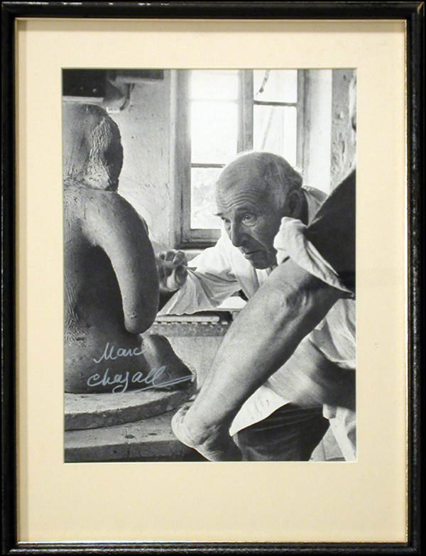 Nice 10 x 13 photo of Chagall working in his studio, signed in white artists pencil. Matted and framed to an overall size of 12.75 x 18. In fine condition. RRAuction COA.
