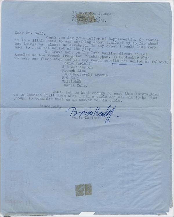 TLS, one page, 8 x 10 light blue stationery with integral mailing panel on reverse, September 10, 1957. A letter to a representative of MCA. In part: 'Of course it is a little hard to say anything about availability so far ahead but things can always be arranged. I would like very much to read the script of the play.' Karloff goes on to explain that he will be sailing to Los Angeles and that he can be reached 'with the script' on the SS Washington in the Canal Zone and closes with 'Would you be kond [sic] enough to pass this information on to Charles Pratt from whom I had a cable and ask him to be kind enough to consider that as an answer to his cable.' In fine condition, with two small squares of adhesive residue at top and bottom borders, border wear, a horizontal crease affecting the tops of a few letters of the signature and scattered light creasing. RRAuction COA.
