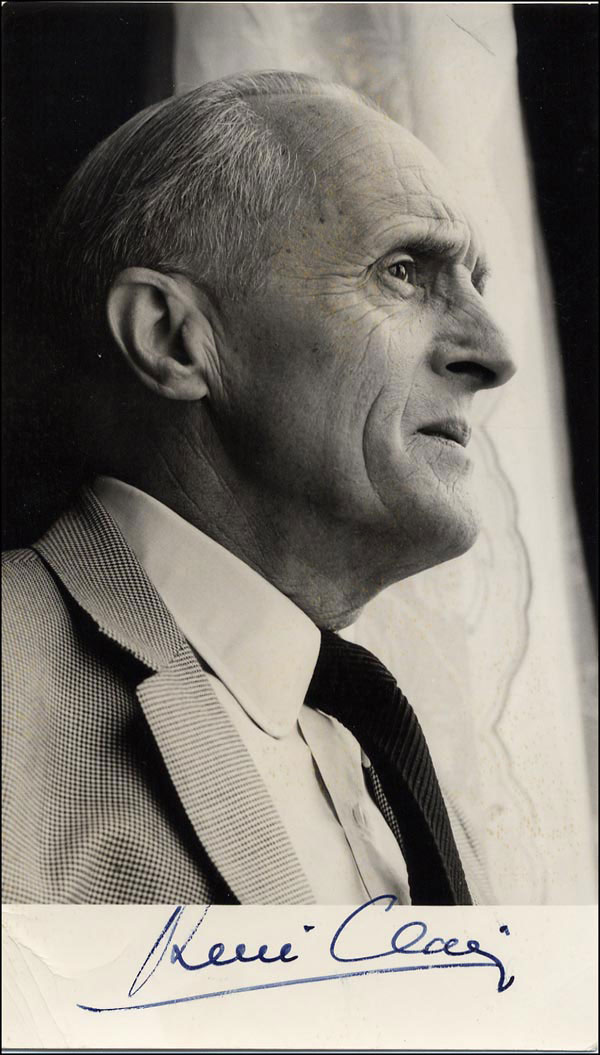 French film writer and director. Glossy 3.75 x 6.5 profile photograph signed in fountain pen in the wide lower border. In fine condition, with light corner creasing, slight skipping to one of the letters in the signature. RRAuction COA.