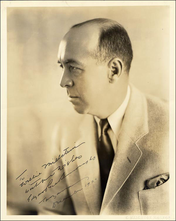 Creator of Tarzan. Vintage sepia C. Heighton Monroe glossy 8 x 10 profile portrait, signed and inscribed in fountain pen 'To Willie Millstein with best wishes, Edgar Rice Burroughs, Tarzan, December 1933.' In fine condition, with scattered light creasing, a couple of creases (one touching his face), a couple of areas of minor silvering none of which affects the outstanding image and signature. RRAuction COA.